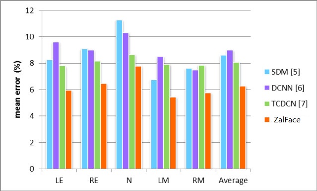 本算法在AFLW數(shù)據(jù)集上的定位誤差及與其他算法的對比情況: