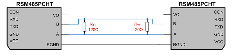 因此為了防止485總線(xiàn)出現(xiàn)上述情況,通常在485總線(xiàn)上增加上下拉電阻(通常A接上拉電阻,B總線(xiàn)下拉電阻)。若使用隔離RS-485收發(fā)模塊(例如RSM485PCHT),由于模塊內(nèi)部具有上下拉電阻(對(duì)于RSM485PCHT,內(nèi)部上下拉電阻為24kΩ),因此在模塊外部一般不需要增加上下拉電阻。
