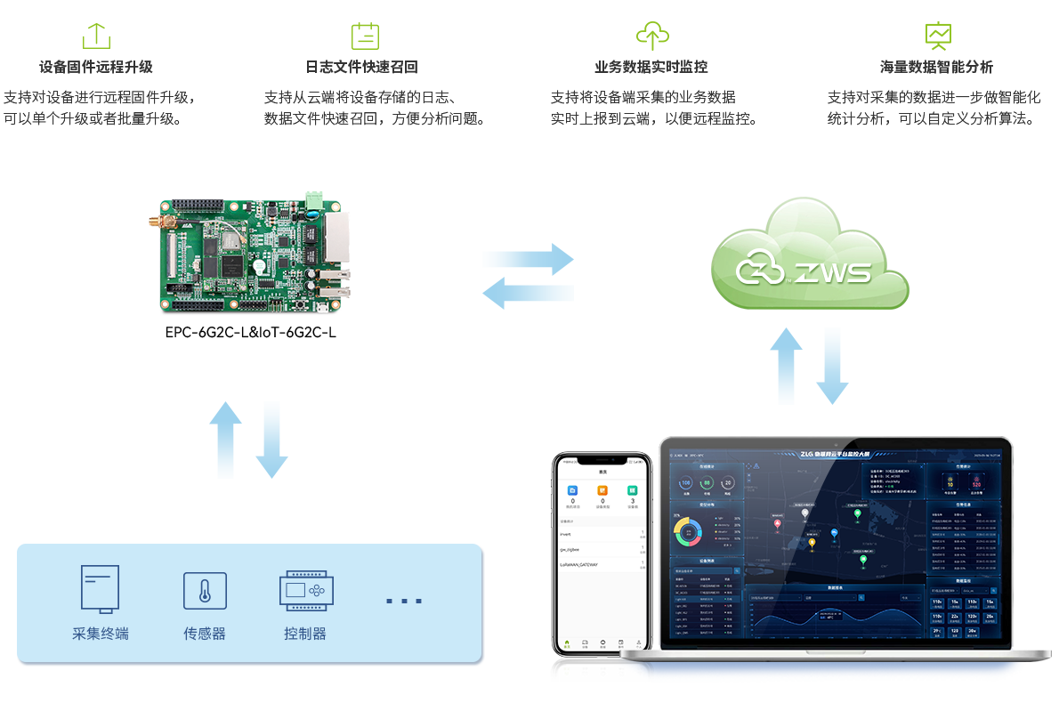 基于致遠電子自主研發(fā)的ZWS物聯(lián)網(wǎng)云平臺,讓設(shè)備實現(xiàn)智能化升級,支持遠程固件升級、日志文件快速召回、業(yè)務(wù)數(shù)據(jù)監(jiān)控、組態(tài)可視化呈現(xiàn)、海量數(shù)據(jù)分析等功能。